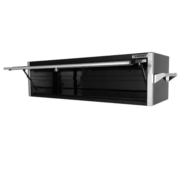 Husky black tool locker, Model HPR063TLOCKERBL, featuring a sturdy construction with a secure locking mechanism. The tool locker displays visible scratches and dents on its exterior. Includes a SmartKey security system. Pickup only.