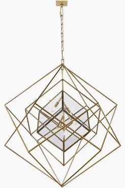 Kelly Wearstler KW 5022G-CG Cubist Large Chandelier in Gild. The chandelier features a modern, geometric design with gilded finishes. Packaged securely in its original box with protective foam for safe handling. Pickup only.