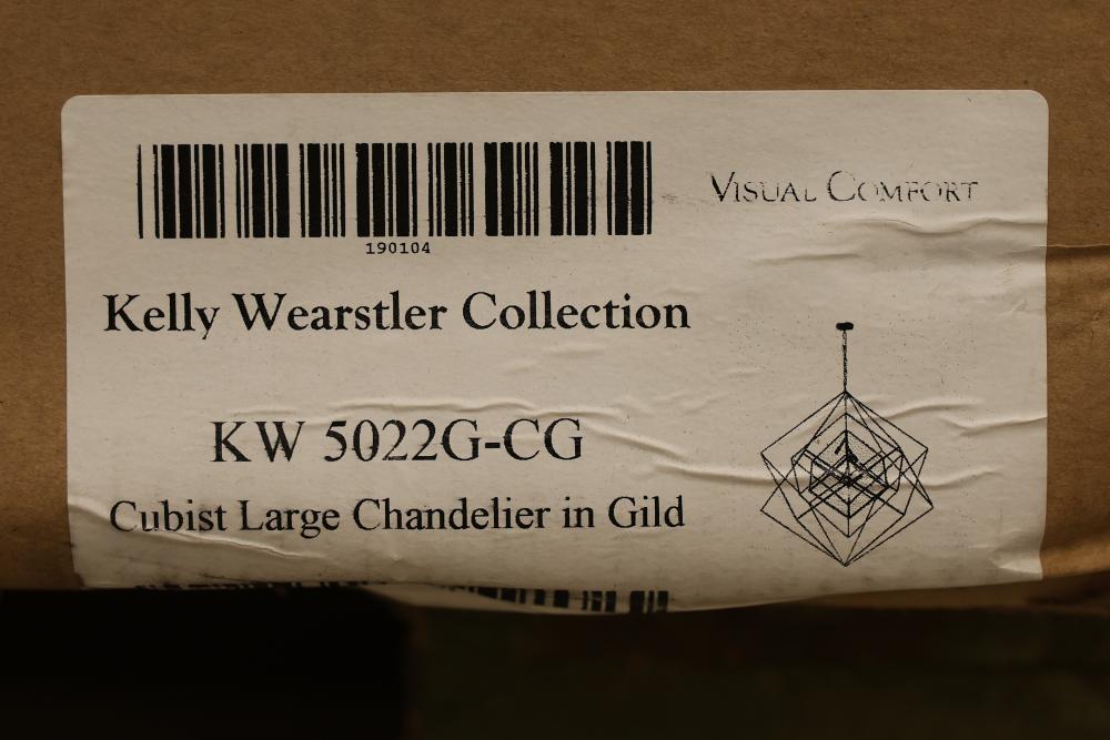 Kelly Wearstler KW 5022G-CG Cubist Large Chandelier in Gild. The chandelier features a modern, geometric design with gilded finishes. Packaged securely in its original box with protective foam for safe handling. Pickup only.