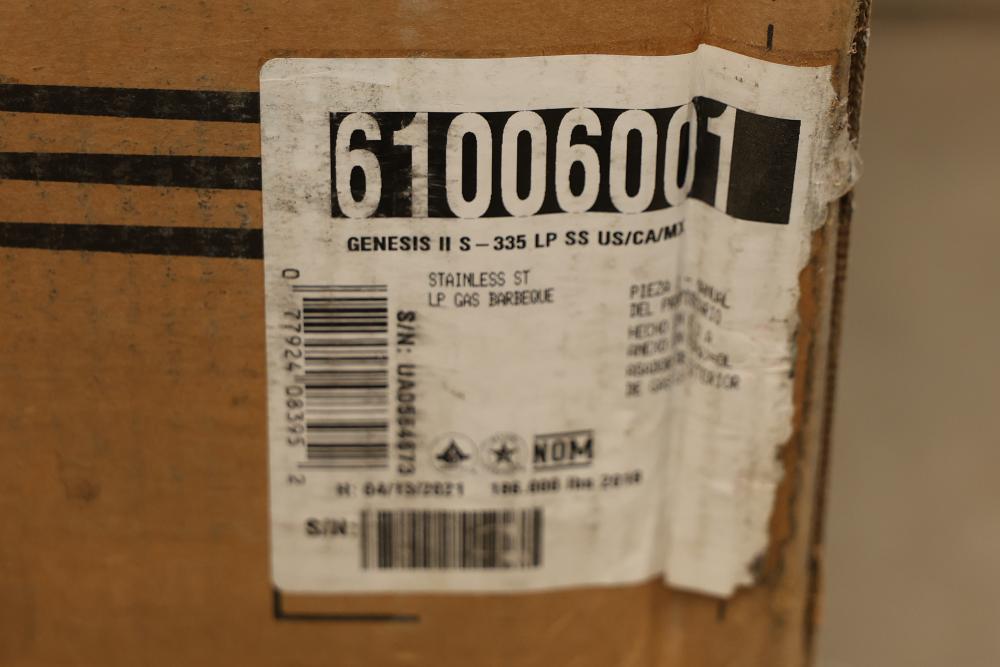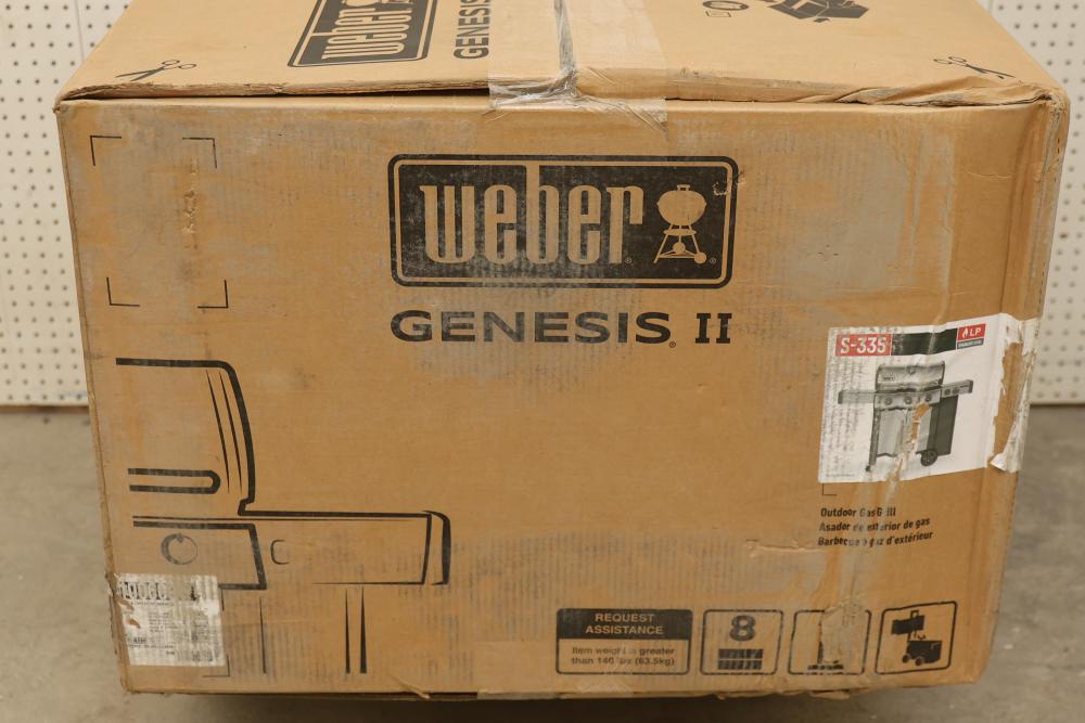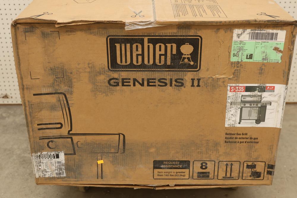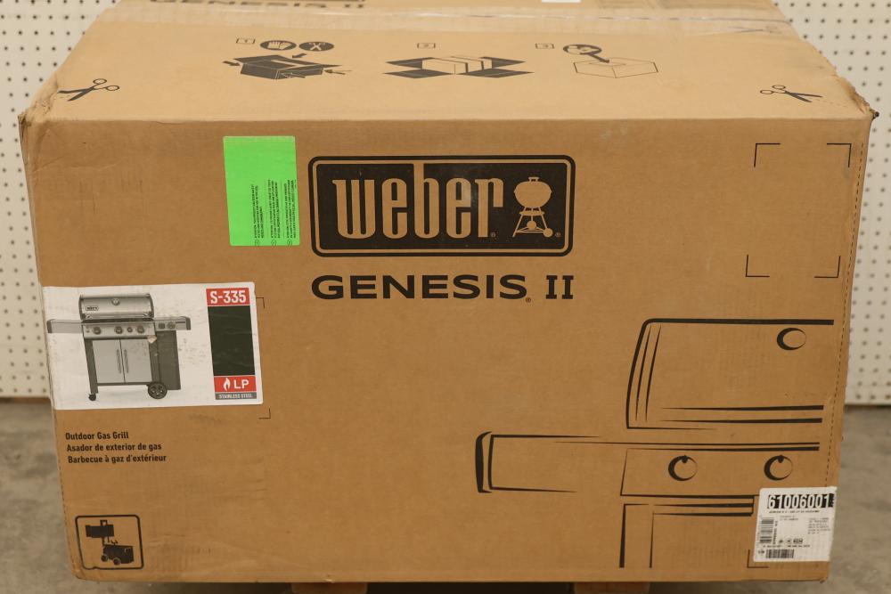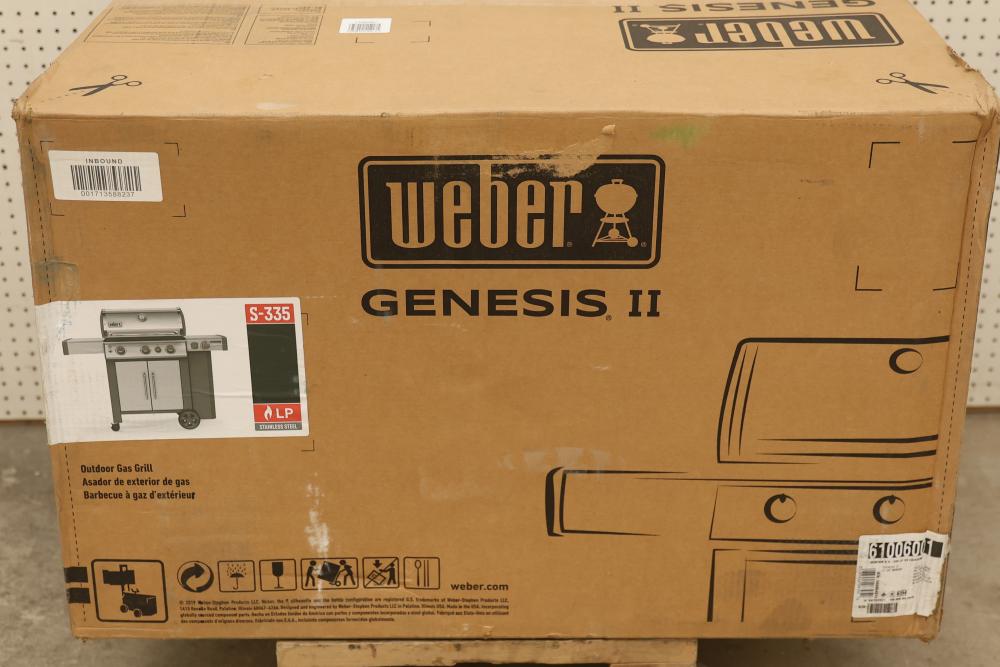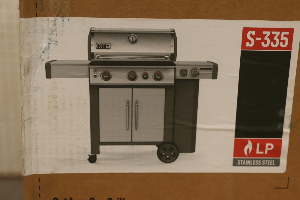 Weber Genesis II S-335 LP Gas Stainless Steel Grill. Features stainless steel construction, three burners, an enclosed cabinet, and comes with instruction manual. Item is new in its original packaging. Pickup only.