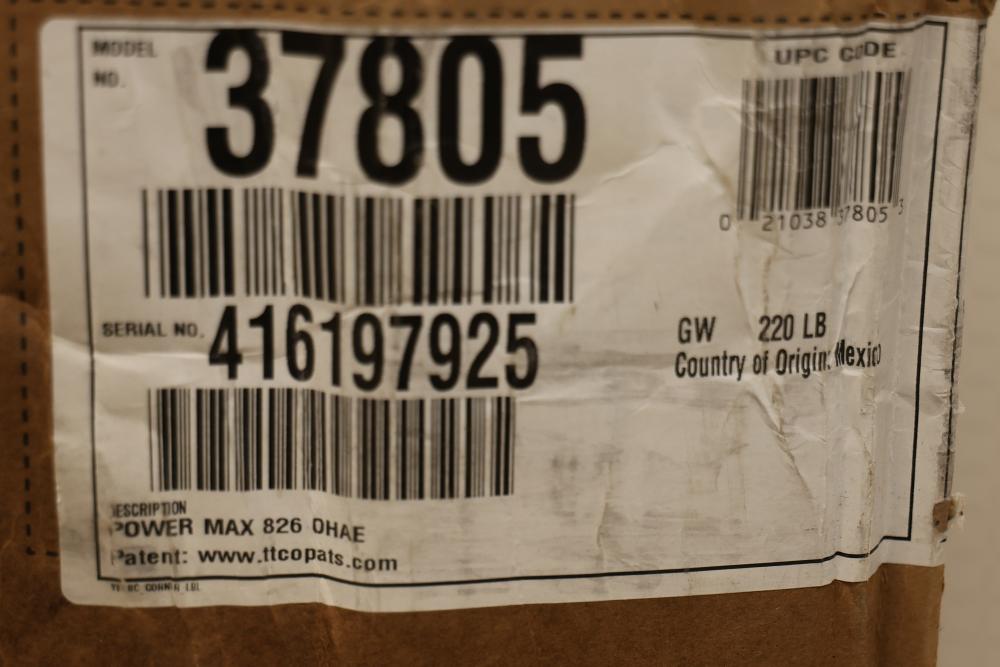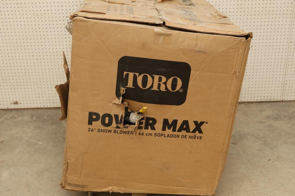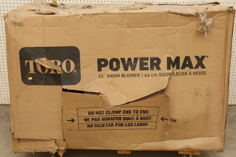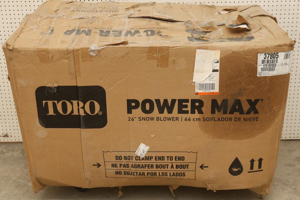 Toro Power Max 826 OHAE electric start snow blower, Model 37805, featuring a 252cc engine, a 26 inch clearing width, hand warmers, and LED lights. Pickup only.