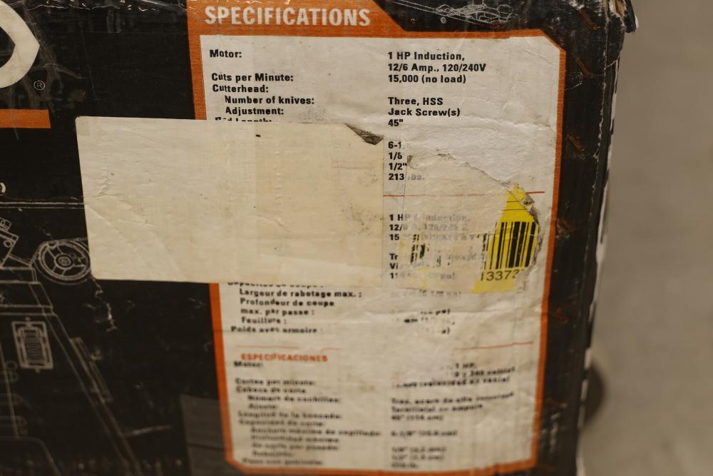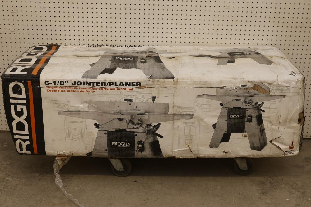 Ridgid 6 and 1/8 Inch Jointer/Planer Model JP06101. Features a 1 HP induction motor with a 15,000 RPM single-speed cutterhead, three HSS jack screws, and 45-degree fence adjustment. The unit is packaged in its original box, with the operators manual and parts included. Pickup only.