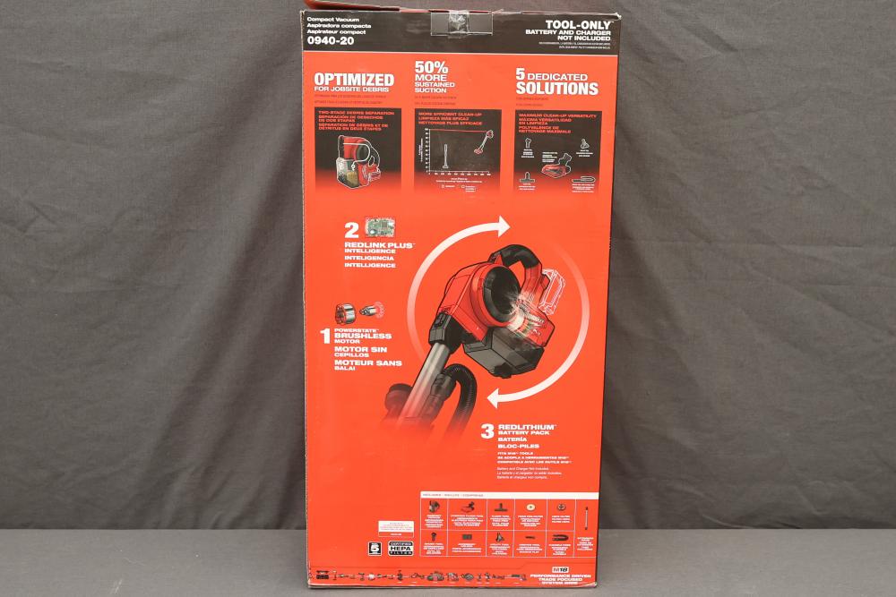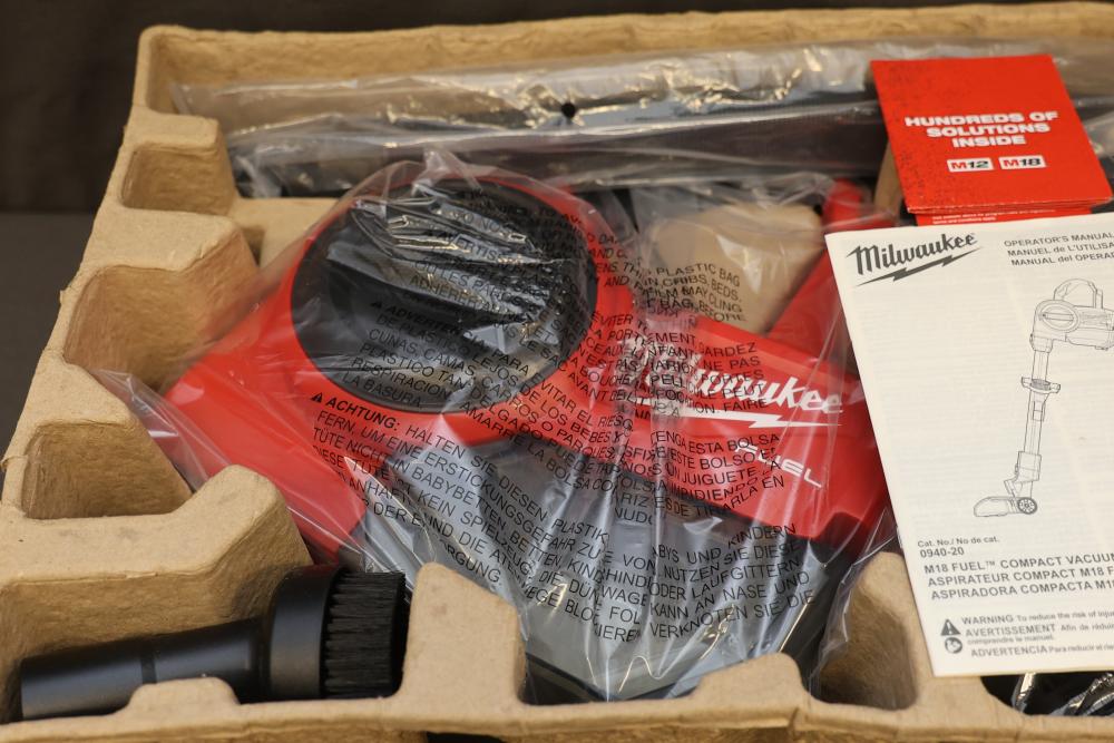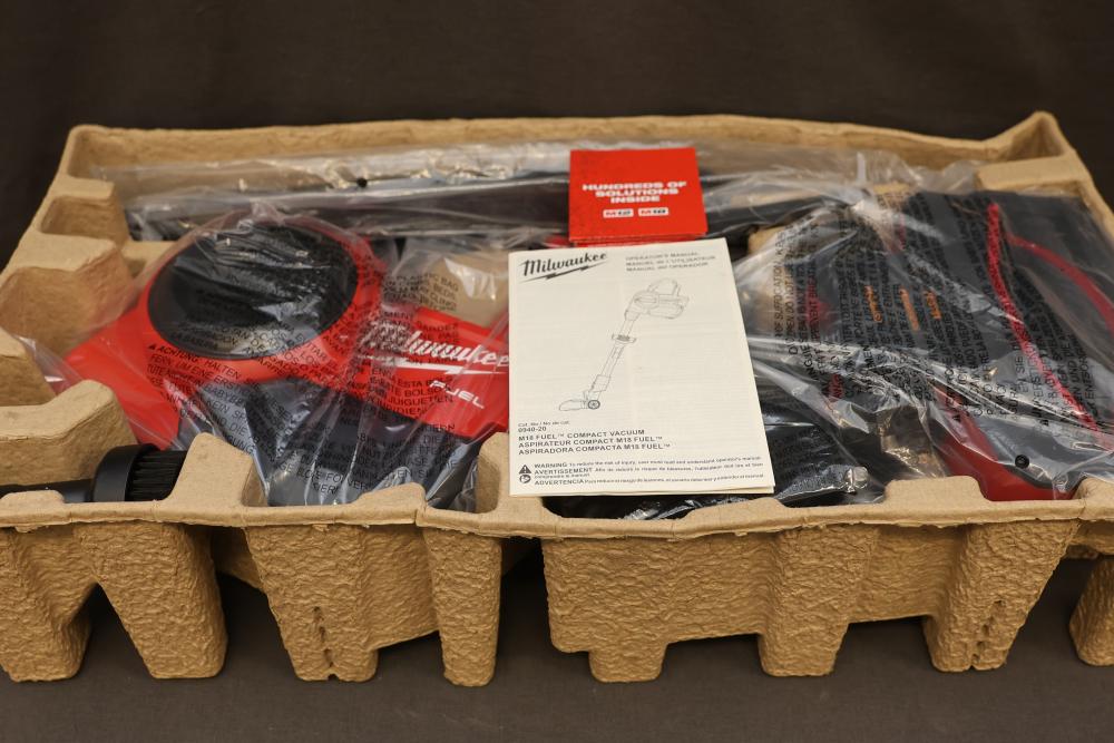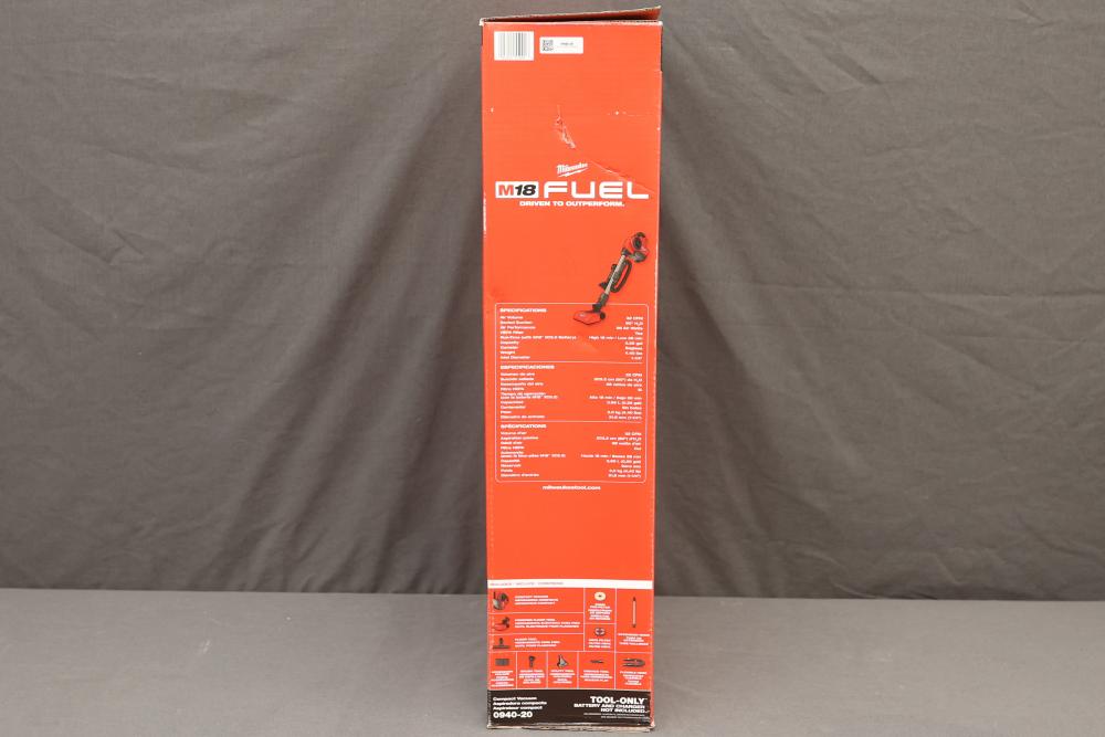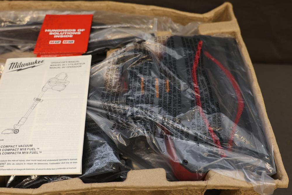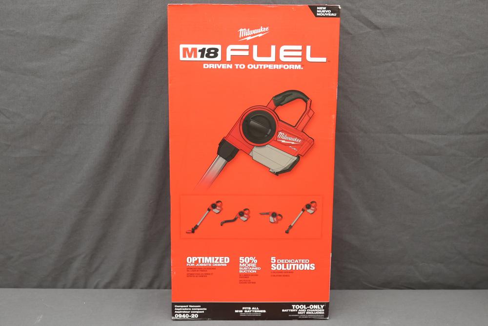 Milwaukee M18 Fuel Compact Vacuum 0940-20 (Tool Only). Designed for powerful performance with optimized suction and versatility for various professional cleaning applications. Includes vacuum components, manual, and packaging. Product is new and comes as the 'tool only', requiring compatible Milwaukee M18 battery (not included). Pickup only.