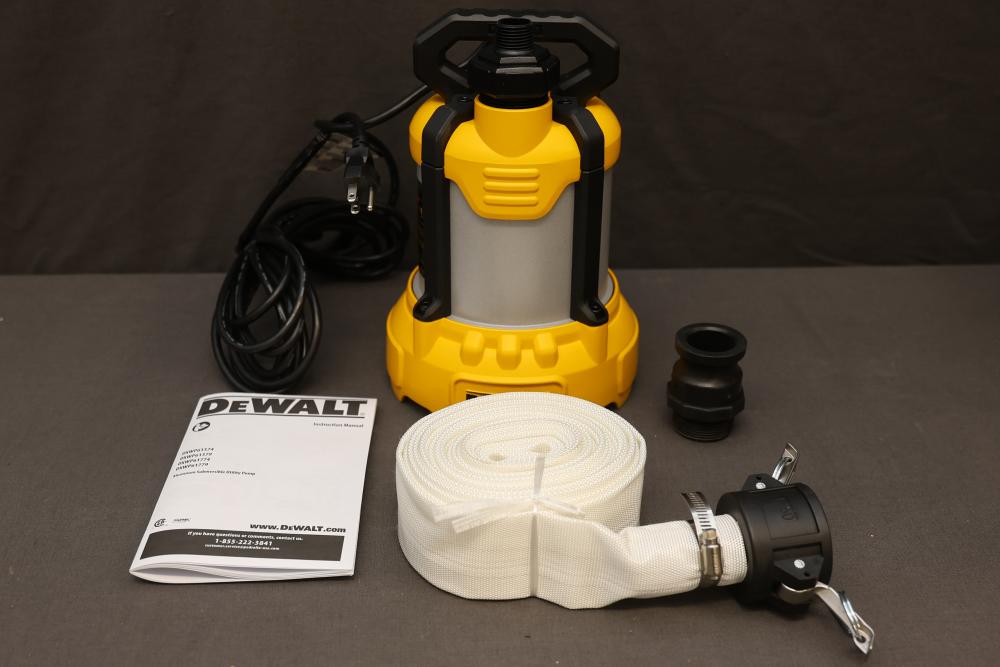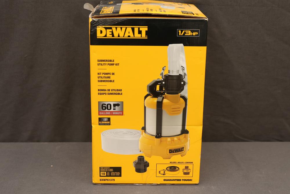 Dewalt 1/3 HP 115V Submersible Utility Pump Kit DXWP61379. Includes a powerful 1/3 HP motor, 115V capacity, and designed for efficient water removal. Comes with a durable pump, hose, fittings, and an instruction manual. Features 60-minute auto shutoff and a thermoplastic construction for durability. Pickup only.