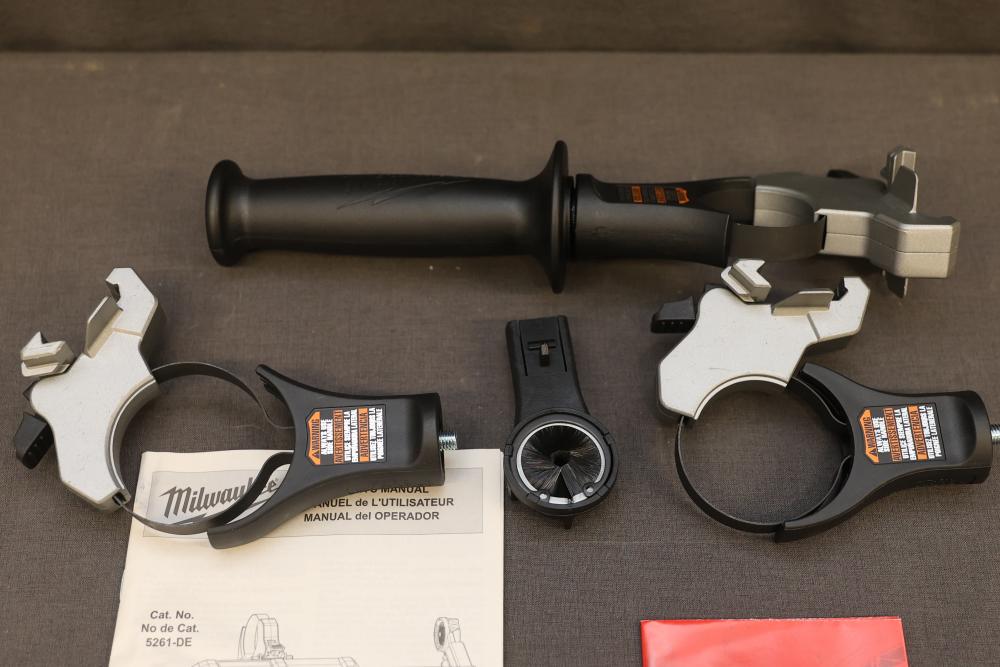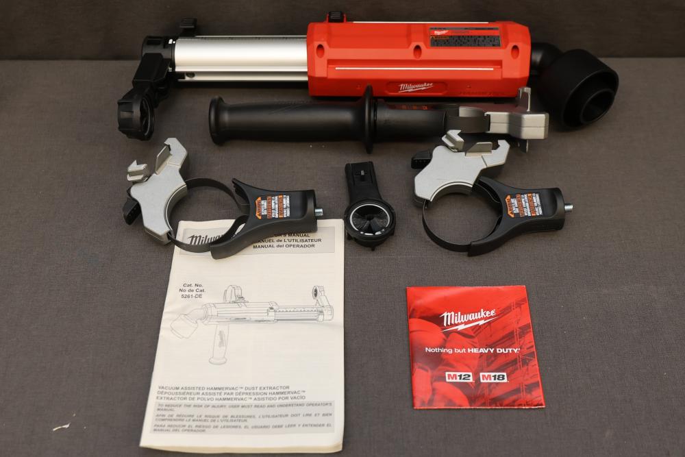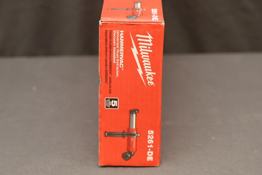 Milwaukee Hammervac Universal Dust Extractor, Vacuum Assisted 5261-DE. Includes the Milwaukee 5261-DE unit, handle, multiple clamps, and manuals. Designed for efficient dust extraction and universal fitment. Ideal for use with rotary hammers and compatible tools. Pickup only.