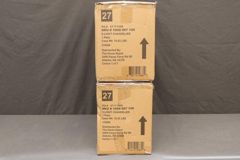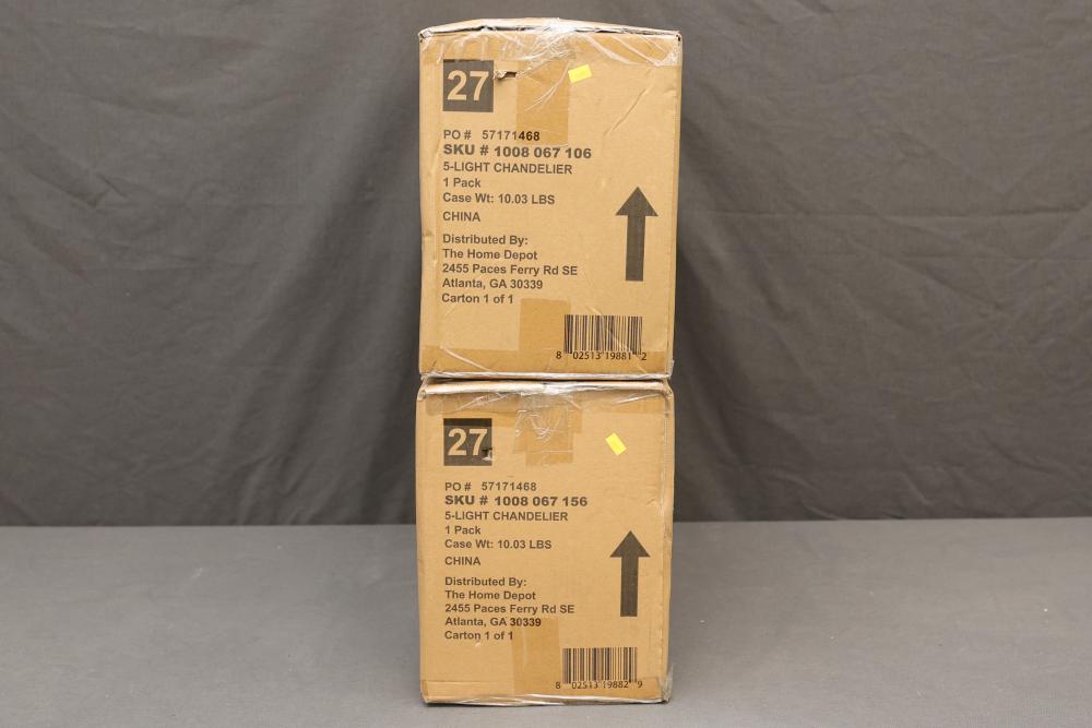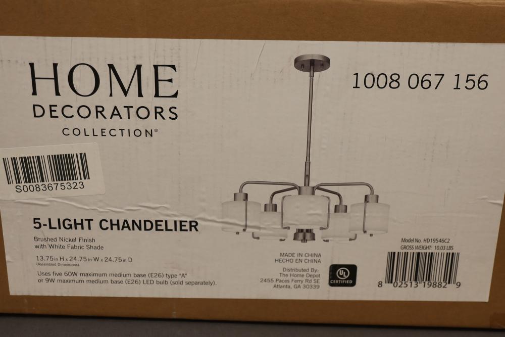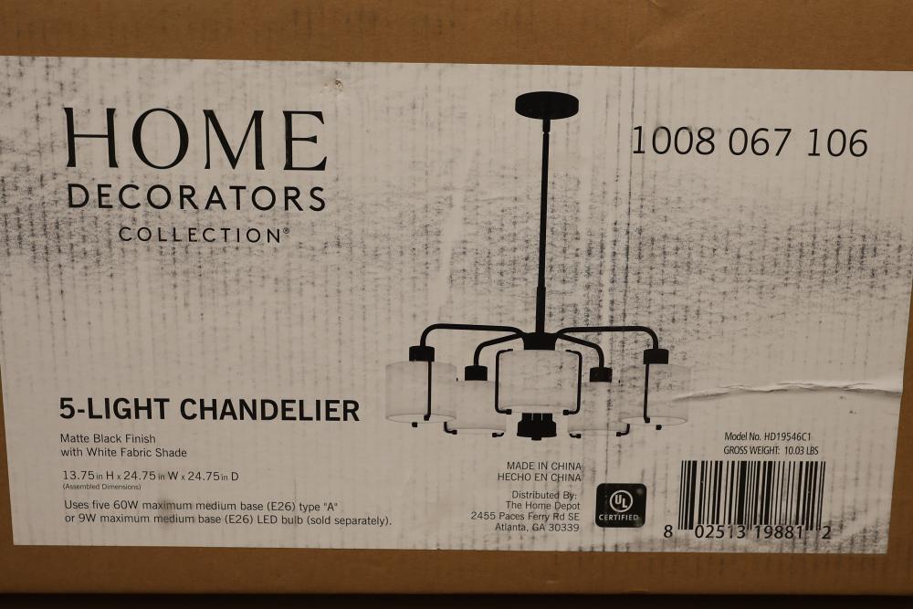 Two Home Decorators Collection 5-Light Chandeliers - One in Brushed Nickel Finish with White Fabric Shade, one in Matte Black Finish with White Fabric Shade. Each chandelier features a modern design, suitable for various room settings. Pickup only.