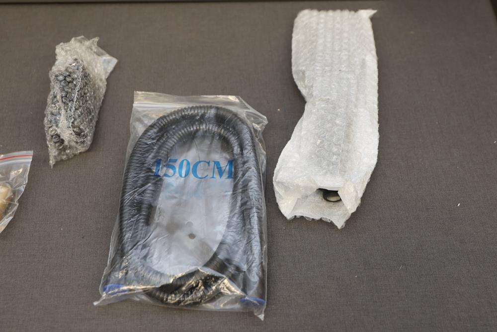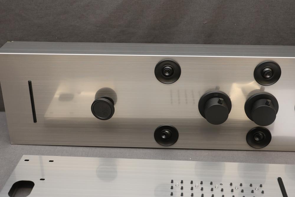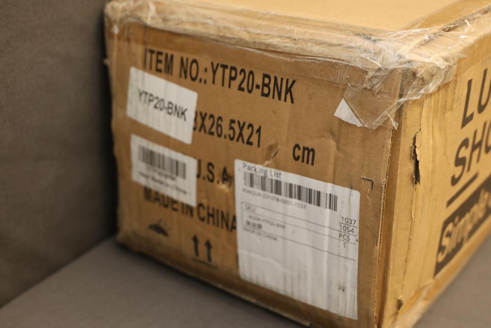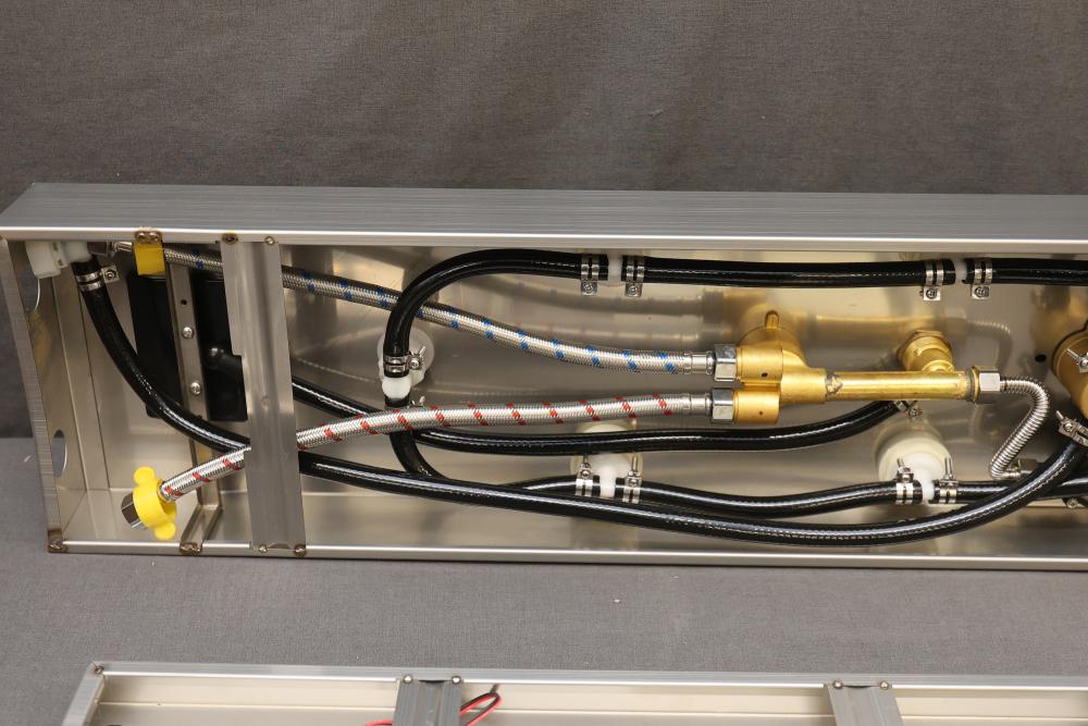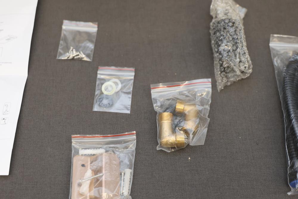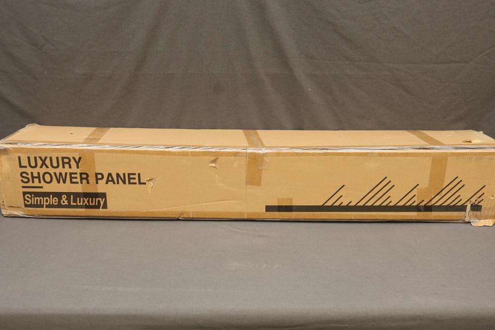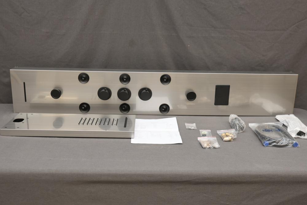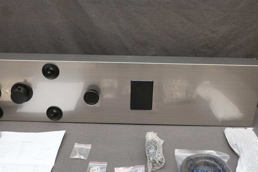 BWE Onyx Spa All-in-One Black and Nickel 20 Inch Waterfall Dual Head Shower Toner System with 6-Way Diverter. Includes a ceramic disc valve (YTP20-BNK). Features a sleek black and nickel finish, dual shower heads, six-way diverter, and waterfall option. Comes with various hardware components as pictured. Pickup only.