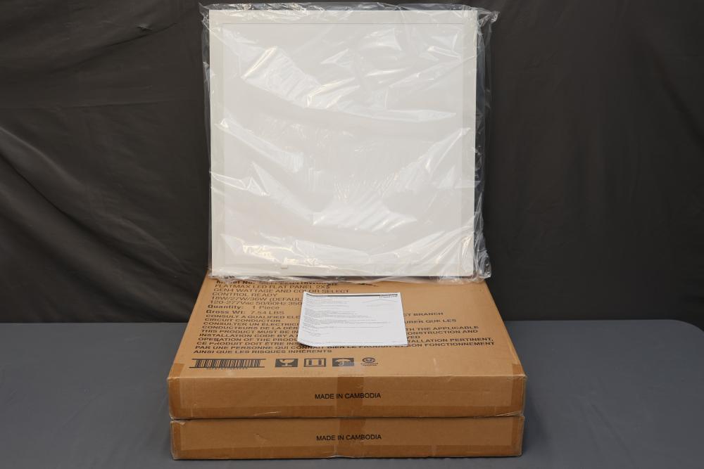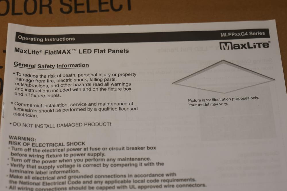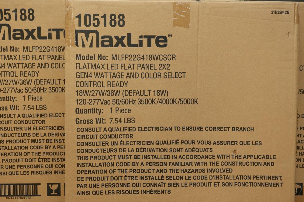 MaxLite 105188 FlatMax LED Flat Panel 2 ft by 2 ft, Gen 4 Wattage Selectable (18W, 27W, 36W) with color options (3500K, 4000K, 5000K). Control Ready with input range of 120-277VAC, 50/60 Hz. Designed for damp locations. Each panel weighs 7.54 lbs. Quantity of 3 included. Pickup only.