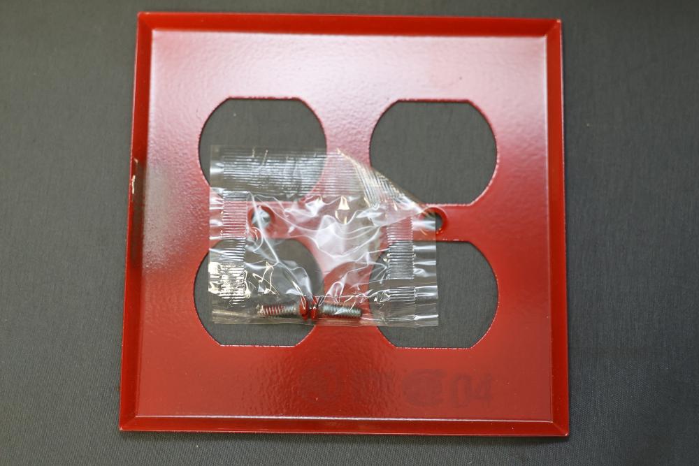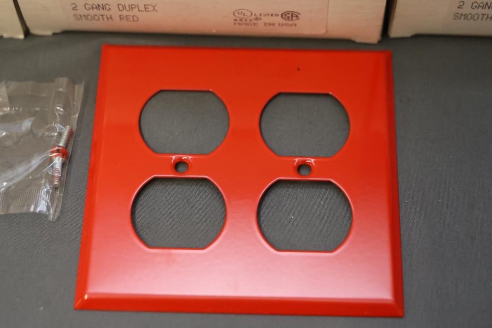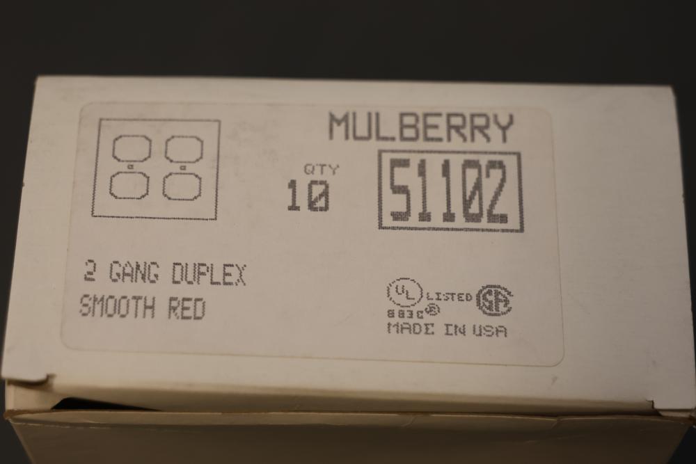Mulberry 51102 Metal Duplex Faceplate, 2 Gang, in Red - 6 cases of 10 - 60 total. Each case contains 10 smooth red faceplates with screws included, designed for a secure and professional installation. All units are new and packaged in individual protective sleeves. Pickup only.