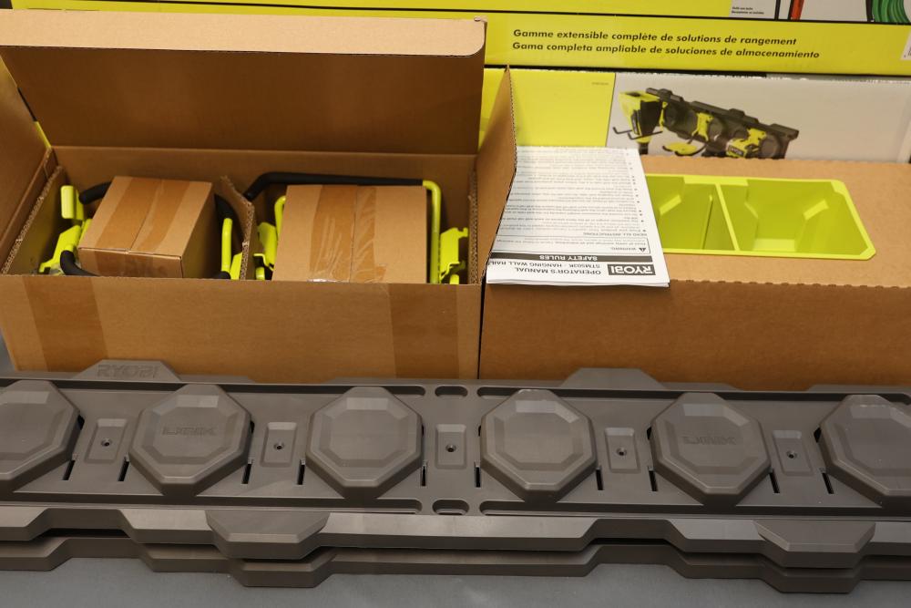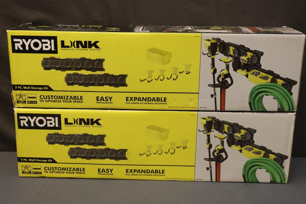 Ryobi Link 7 Piece Wall Storage Kit (STM503K) - 2 Cases. Includes two kits, each with wall storage rails, hooks, and a storage bin. Design optimized for space-saving and easy installation. Pickup only.