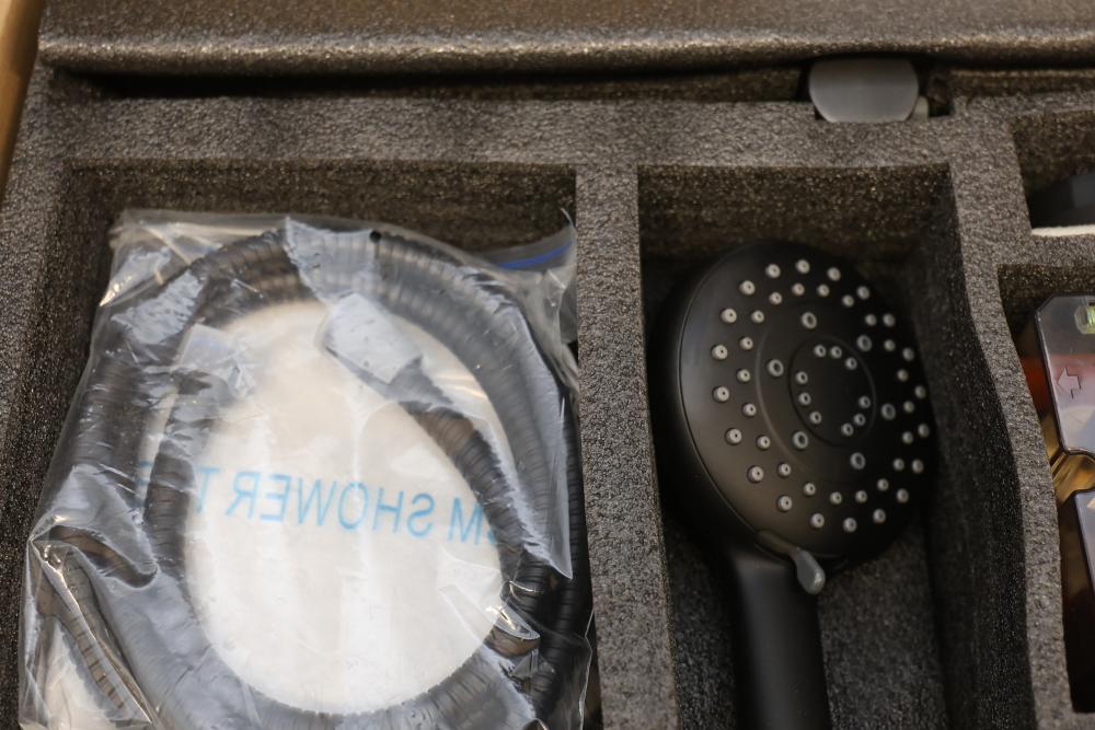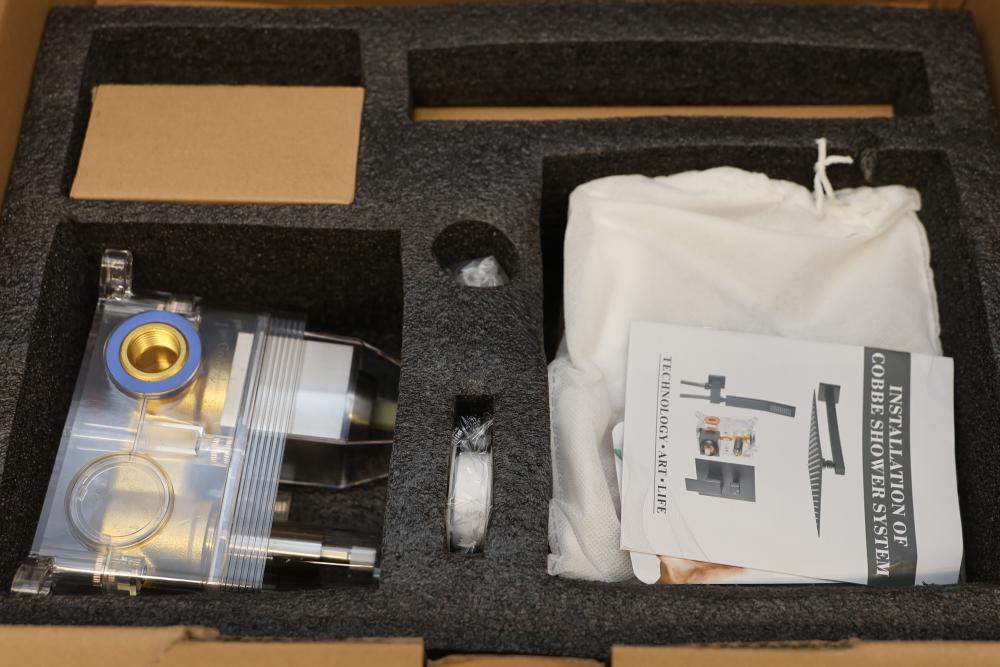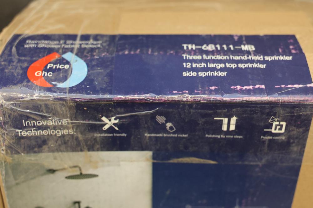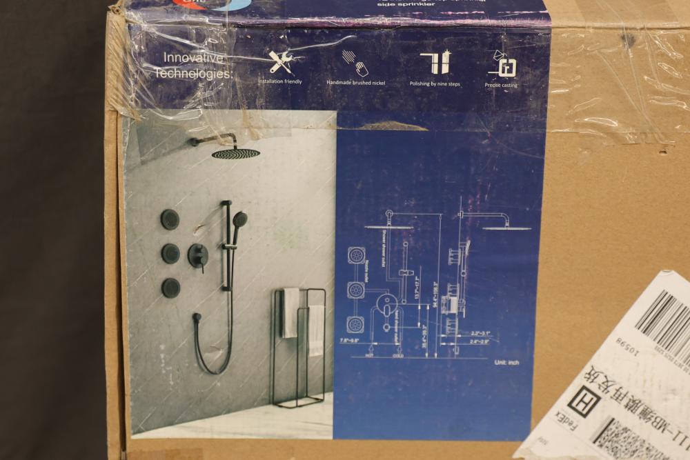 Innovative Technologies Shower System in Matte Black with Cobbe Shower System. Includes shower head, hand shower, slide bar, shower arms, hoses, valve trims, and lever handles. All components carefully packaged in original boxes with instructions for installation. Sleek matte black finish for a modern look. Pickup only.