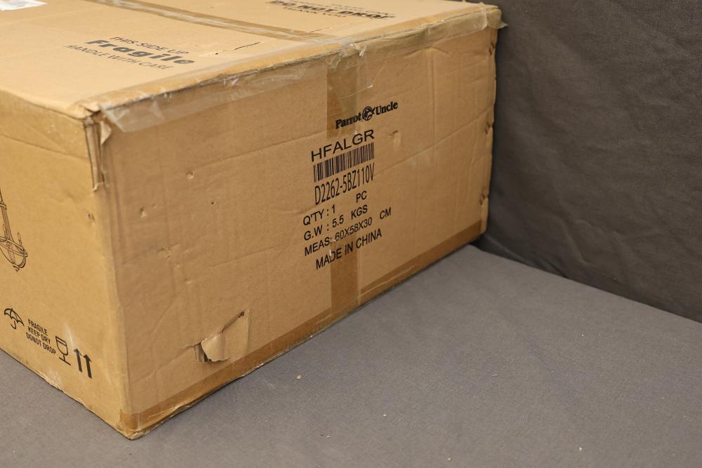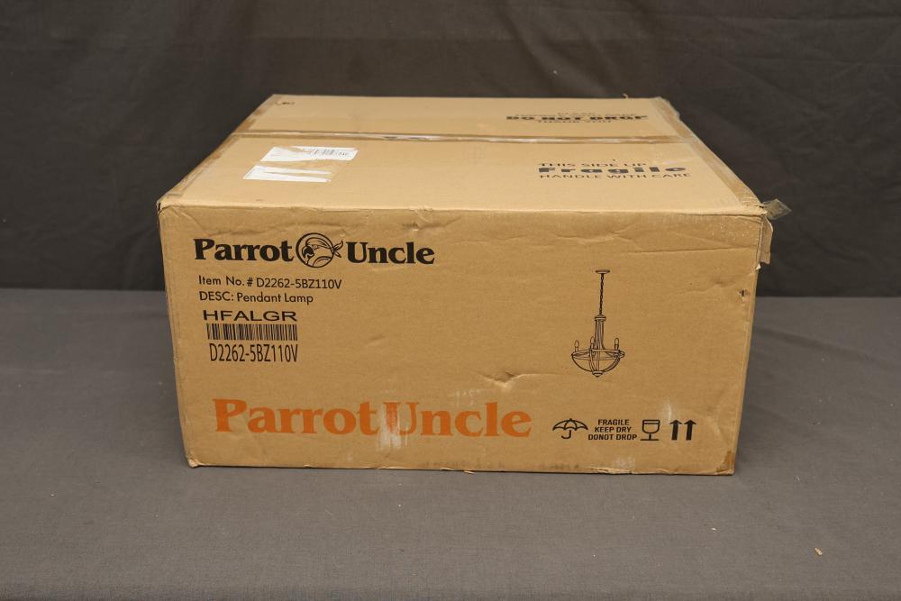 Parrot Uncle Pendant Lamp (D2262-5BZ110V). This pendant lamp features a stylish design with multiple light sockets and a black-bronze finish. The fixture is new and comes in its original box with parts securely packaged. The box is labeled with model details, ensuring authenticity. Pickup only.