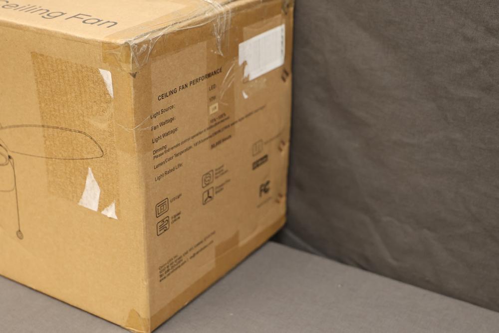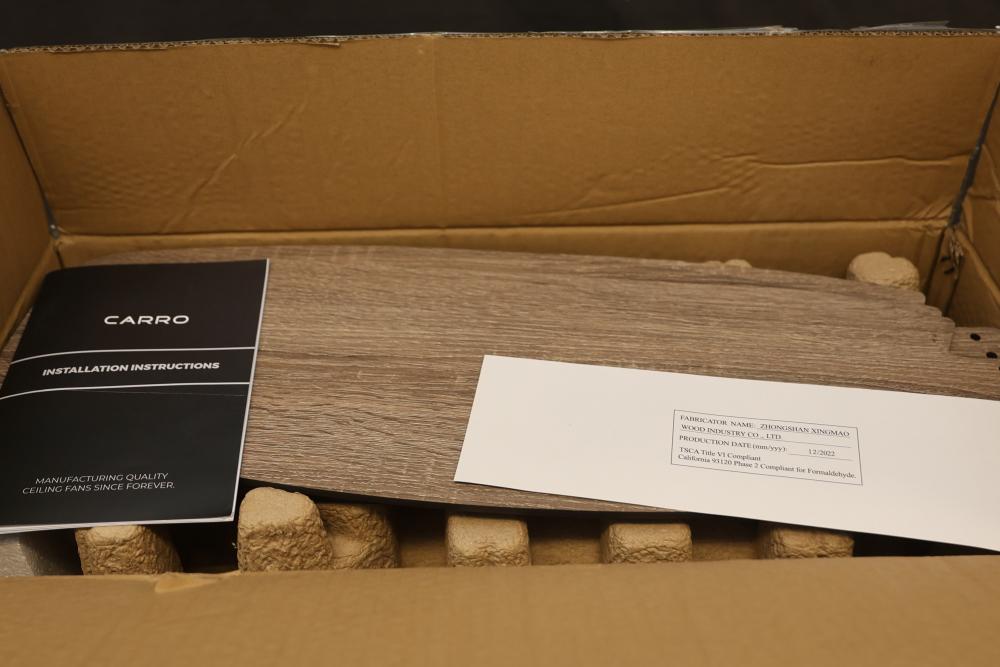 Carro CFP523Q5L 52 Inch Ceiling Fan, featuring a sleek design with durable materials and equipped with a built-in LED light and remote control. The box includes the fan blades, installation instructions, and all necessary components for setup. Pickup only.