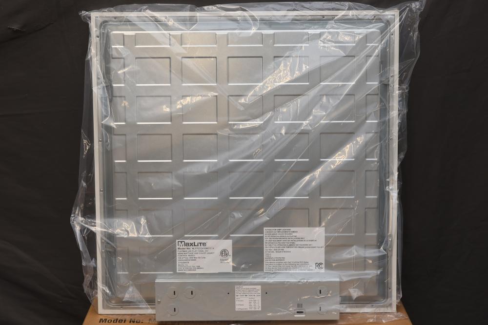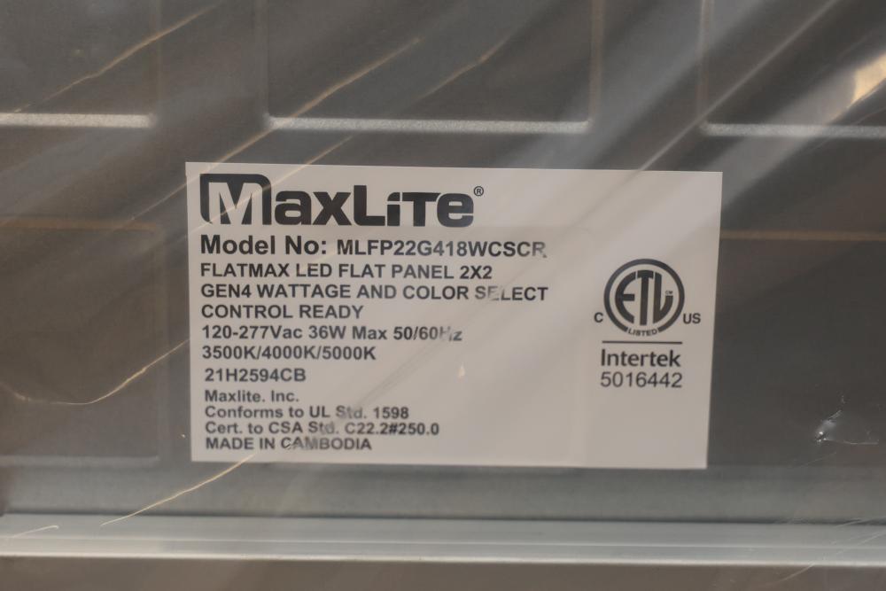 MaxLite 105188 FlatMax LED Flat Panel 2 ft by 2 ft, Gen 4 Wattage, Color Select, Control Ready. Includes three units with adjustable wattage settings of 18W, 27W, and 36W and selectable color temperatures of 3500K, 4000K, and 5000K. Operates on 120-277 Vac at 50/60 Hz. Suitable for damp locations and installation above ceiling tiles. Pickup only.