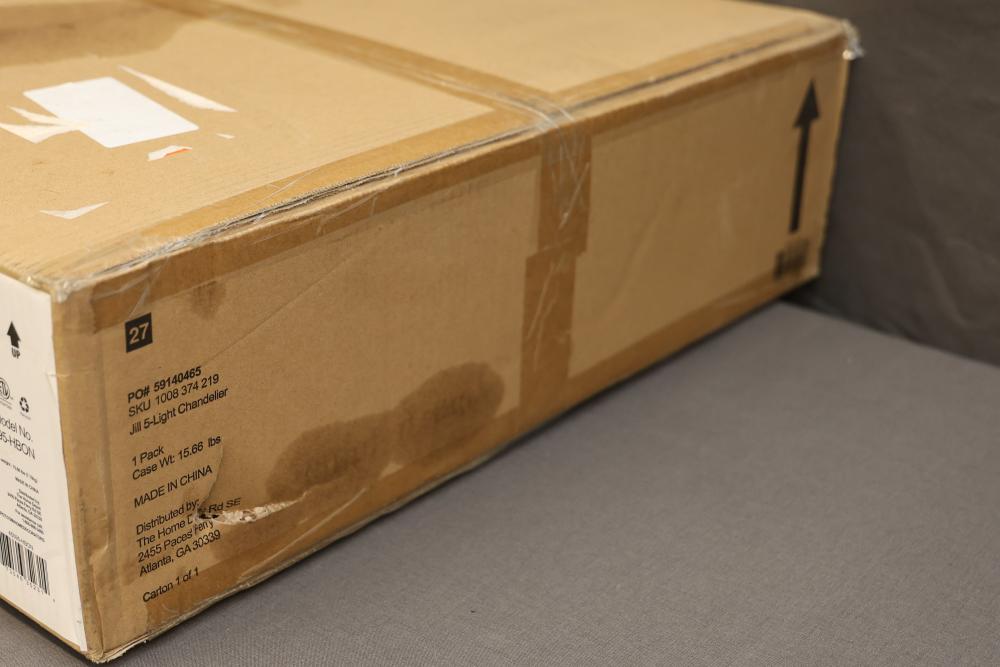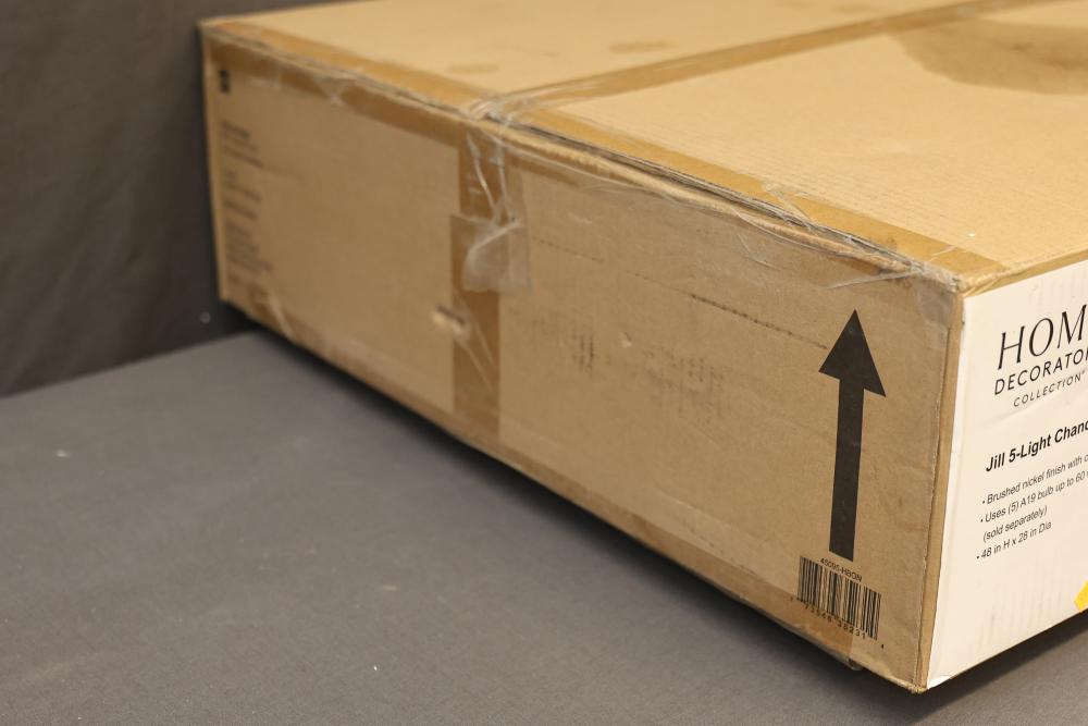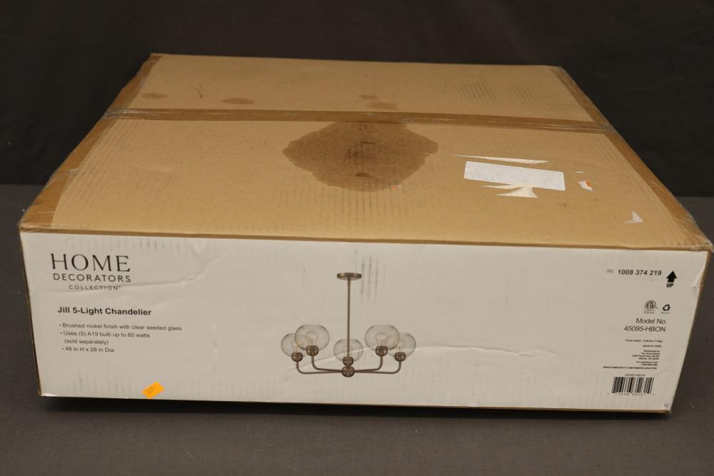 Home Decorators Collection Jill 5-Light Chandelier in Brushed Nickel Finish with Clear Seeded Glass. Features brushed nickel finish and clear seeded glass design. Uses five E26 A19 light bulbs up to 60W each (not included). Dimensions measure 48 inches in width and up to 120 inches in height. Comes in original packaging. Pickup only.