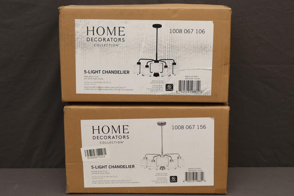 Two Home Decorators Collection 5-Light Chandeliers - One in Brushed Nickel Finish with White Fabric Shade, one in Matte Black Finish with White Fabric Shade. Each chandelier features a modern design, suitable for various room settings. Pickup only.