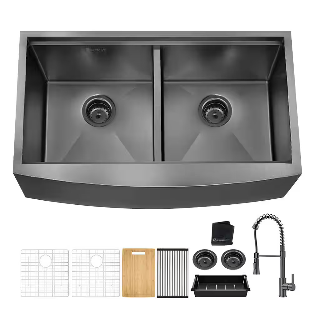 Glacier Bay 36 Inch Farmhouse/Apron Front Single Bowl 18 Gauge Gunmetal Black Stainless Steel Kitchen Sink (ACS3621A1Q). Features an apron front design, gunmetal black stainless steel material, single bowl configuration, and an 18-gauge construction. Includes additional accessories like a cutting board and a drain assembly. Pickup only.