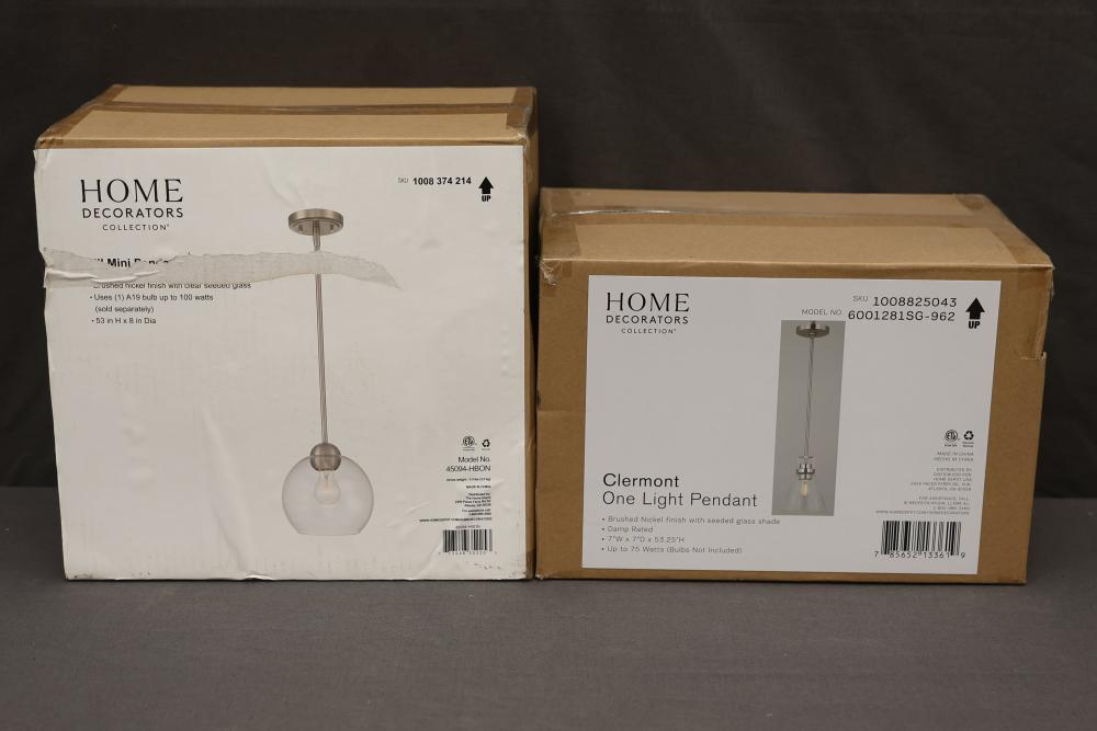 Home Decorators Collection Set of 2 Pendant Lights: Jill Mini Pendant (45094-HBON) and Clermont Light Pendant (6001281SG-962). The Jill Mini Pendant features a clean, modern design with a glass shade, while the Clermont Light Pendant includes a brushed nickel finish with a seeded glass shade. Both items are in original packaging with accessories and documentation. Pickup only.