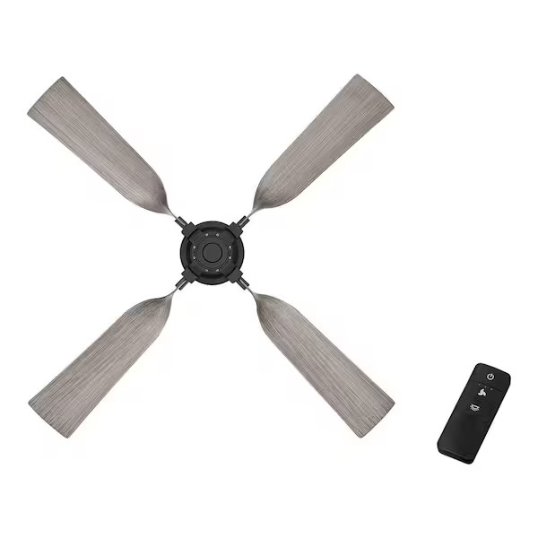Hampton Bay Fortra 56 Inch Ceiling Fan (AK272-MBK). Features include a quiet motor that produces more airflow with less noise and a matte black finish. Includes four graphite oak blades, remote control, and mounting accessories. The fan has a maximum airflow of 6,576 CFM. Pickup only.
