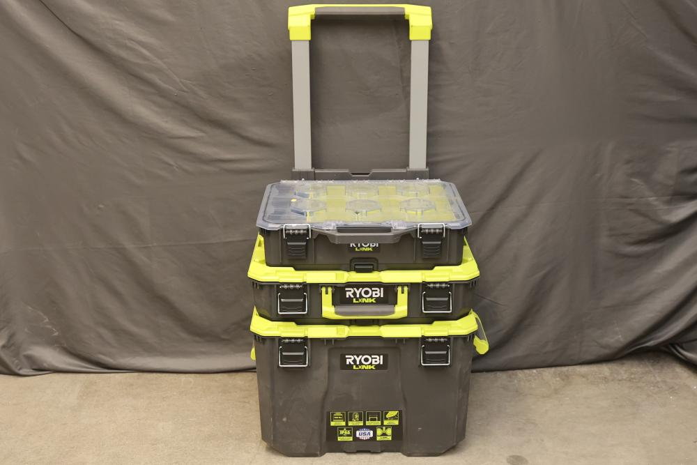 Ryobi Link Rolling Tool Box (STM201) with Ryobi Link Standard Tool Box (STM101) and Ryobi Link 10-Compartment Modular Small Parts Organizer Tool Box (STM303). This set includes durable storage solutions for tools and small parts. The rolling tool box features sturdy wheels and an extendable handle for convenient transport. The standard tool box provides organized storage, and the 10-compartment organizer is ideal for small items. Pickup only.