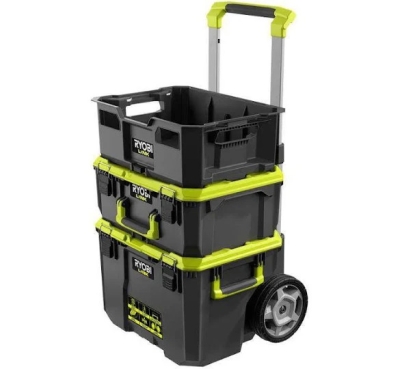 Ryobi Link Rolling Tool Box (STM201) paired with a Ryobi Link Medium Tool Box (STM102) and Ryobi Link Tool Crate (STM104). Includes an integrated rolling system with a sturdy handle and durable wheels for easy transport. The Medium Tool Box and Tool Crate include organizational features such as compartments and bit holders for convenient storage. Pickup only.