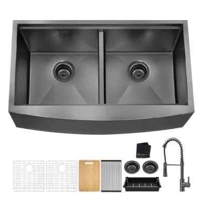 Glacier Bay 36 Inch Undermount Double Bowl 18 Gauge Gunmetal Black Stainless Steel Workstation Kitchen Sink with Spring Neck Faucet, Model ACS3622A2Q-FW. Includes workstation sink, spring neck faucet, and additional accessories. The item is securely packaged in its original box. Box shows visible wear but contents are protected. Pickup only.