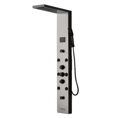 BWE Onyx Spa All-in-One Black and Nickel 20 Inch Waterfall Dual Head Shower Toner System with 6-Way Diverter. Includes a ceramic disc valve (YTP20-BNK). Features a sleek black and nickel finish, dual shower heads, six-way diverter, and waterfall option. Comes with various hardware components as pictured. Pickup only.