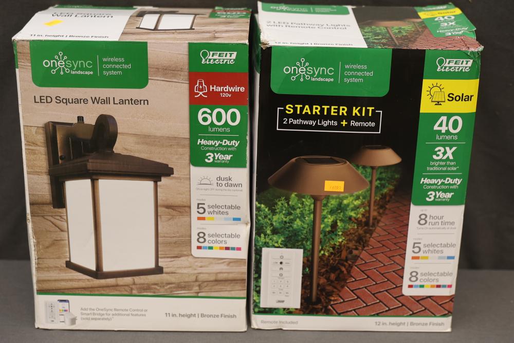 OneSync LED 11 Inch Square Wall Lantern in bronze finish with 600 lumens, hardwired 120v setup, and ability to integrate into a wireless control system. Includes a OneSync Solar Starter Kit with 2 12-inch LED pathway lights, each with 40 lumens, a bronze finish, and a remote control. Both components are designed for durable, outdoor use. Pickup only.