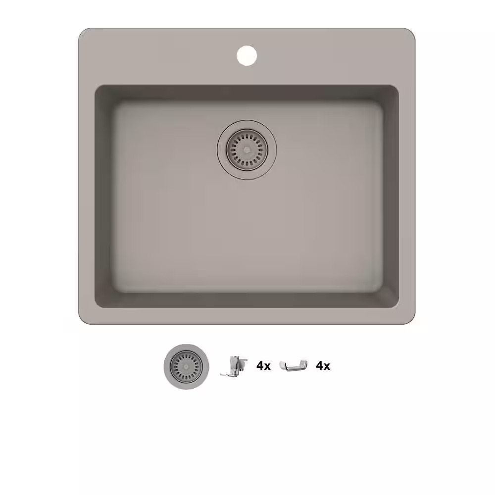 Glacier Bay Stonehaven 25 Inch Drop-In Single Bowl Taupe Ice Granite Composite Kitchen Sink with Taupe Strainer. Features durable granite composite construction and a taupe ice finish. Includes a matching taupe strainer. Model STHVTN100SDM 42. Pickup only.