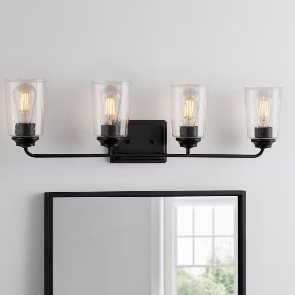 Hampton Bay 32 and 3/8 Inch 4 Light Vanity Evangeline Matte Black Finish with Clear Seeded Glass Shades (Model No. 1017HBMBDI). Features a modern matte black finish with clear seeded glass shades for a stylish design. Item is new in the original packaging. Pickup only.