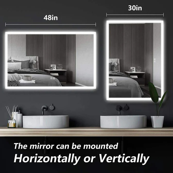 Roomtec Double Control Square A Bathroom Mirror (X002TZLIND-OL). Features a rectangular design with dimensions of 48 inches by 30 inches. Equipped with LED lighting and heating film for defogging, operating at 110V with a power of 47W. Includes IP44 and IP54 certifications for electrical safety and water resistance. Pickup only.