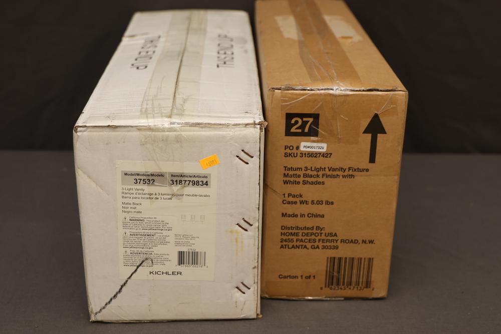 Kichler 3-Light Vanity in Matte Black (37532) and Home Decorators Collection Tatum 3-Light Vanity Fixture with a Matte Black Finish and White Shades (315627427). Includes original packaging. Both fixtures feature a matte black finish and support up to 100W or LED equivalents (bulbs not included). Pickup only.
