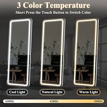 Neutypechic 20 Inch Wide by 63 Inch High Modern Rectangle Aluminum Alloy FLED Full Length Mirror. Features three adjustable LED light settings: Cool (6000K), Natural (4200K), and Warm (3000K), controlled via touch button. Constructed with a durable aluminum alloy frame in silver finish. Ideal for full-length viewing. Pickup only.
