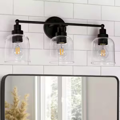 Uolfin Modern Industrial Bell Bathroom Vanity Light 22inch 3-Light Black Dome Wall Light with Clear Glass Shades. Features a black dome finish and clear glass shades. Equipped with three light fixtures for optimal illumination. Packed in its original packaging. Pickup only.