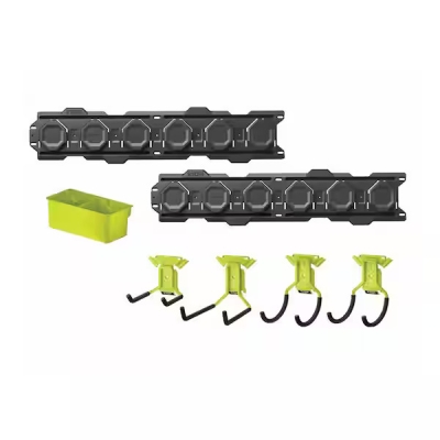Ryobi Link 7 Piece Wall Storage Kit (STM503K) - 2 Cases. Includes two kits, each with wall storage rails, hooks, and a storage bin. Design optimized for space-saving and easy installation. Pickup only.