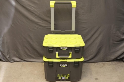 Ryobi Rolling Tool Box (STM201) with a Ryobi Medium Tool Box (STM102) includes stackable tool storage with a rolling unit for portability and a medium-sized box for additional storage. Features include durable wheels, a telescoping handle, interior compartments, and a bit holder. Great for organizing and transporting tools. Pickup only.