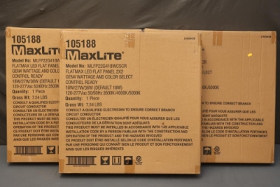 MaxLite 105188 FlatMax LED Flat Panel 2 ft by 2 ft, Gen 4 Wattage Selectable (18W, 27W, 36W) with color options (3500K, 4000K, 5000K). Control Ready with input range of 120-277VAC, 50/60 Hz. Designed for damp locations. Each panel weighs 7.54 lbs. Quantity of 3 included. Pickup only.