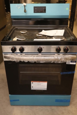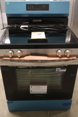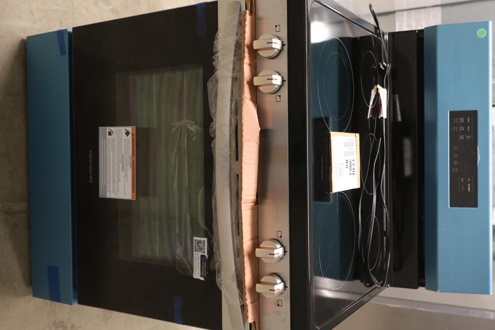 Frigidaire FCRE3083AS 30 inch electric range with air fry feature and a capacity of 5.3 cubic feet. The unit features a sleek cooktop with four burners and user-friendly control knobs. Condition may vary, see photos for details. Pickup only.