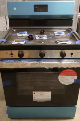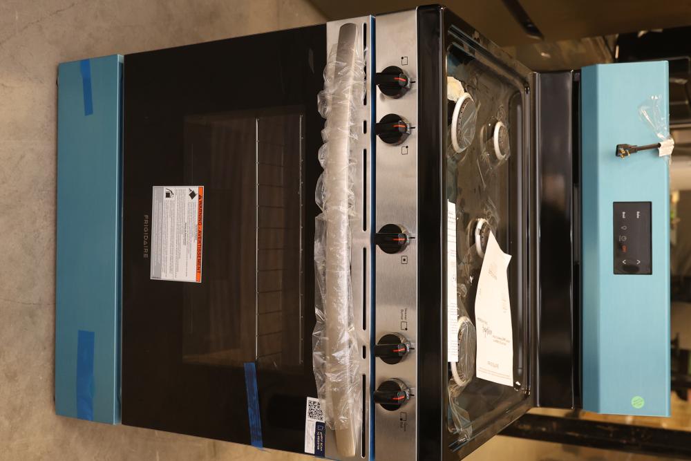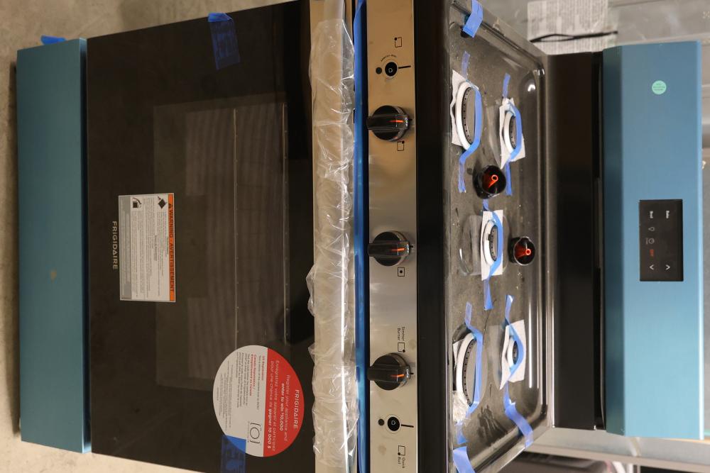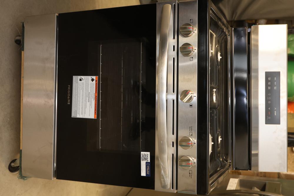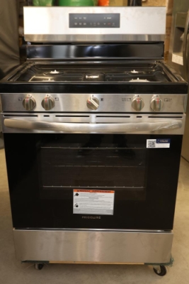 Frigidaire FCRG3052BS 30 inch 5 Burner Freestanding Gas Range in Stainless Steel. Features a spacious oven with racks and a 5-burner gas cooktop. Condition may vary, see photos for details. Operation manual and accessories included. Pickup only.