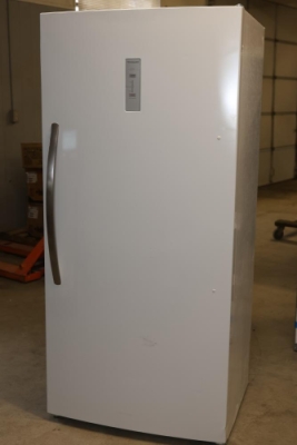 Frigidaire FRAE2024AW 33 inch Garage Ready Single-Door Freezerless Refrigerator in White. Offers 20 cubic feet of capacity. Features include adjustable shelves, multiple door bins, and a stainless steel handle. Condition may vary, see photos for details. Pickup only.