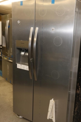 Frigidaire FRSS2623AS 36 inch freestanding side by side refrigerator with a depth of 25.6 cubic feet. Features an external dispenser for cube and crushed ice, as well as water. Includes multiple adjustable storage shelves and compartments. Conditions may vary, see photos for details. Pickup only.