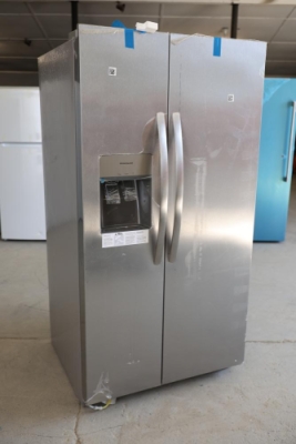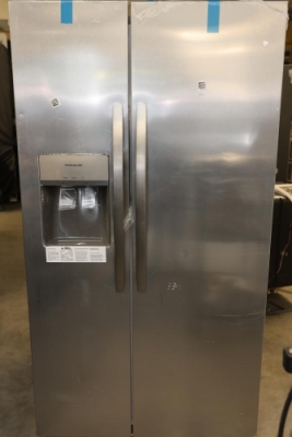 Frigidaire FRSS2623AS 36 Inch Freestanding Side by Side Refrigerator with a capacity of 25.6 cubic feet. Features include internal storage with shelving, ice maker, and water dispenser. Condition may vary, see photos for details. Pickup only.