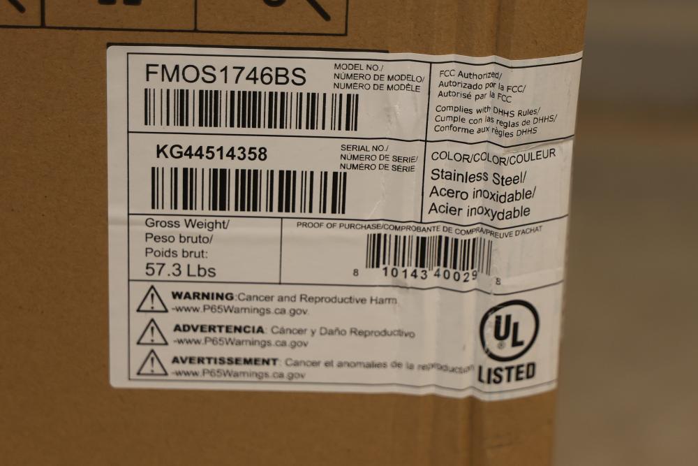 Frigidaire 30 Inch Over-The-Range Microwave FMOS1746BS with 1.7 cubic feet capacity in stainless steel finish. Condition may vary, see photos for details. Includes turntable and accessories. Pickup only.