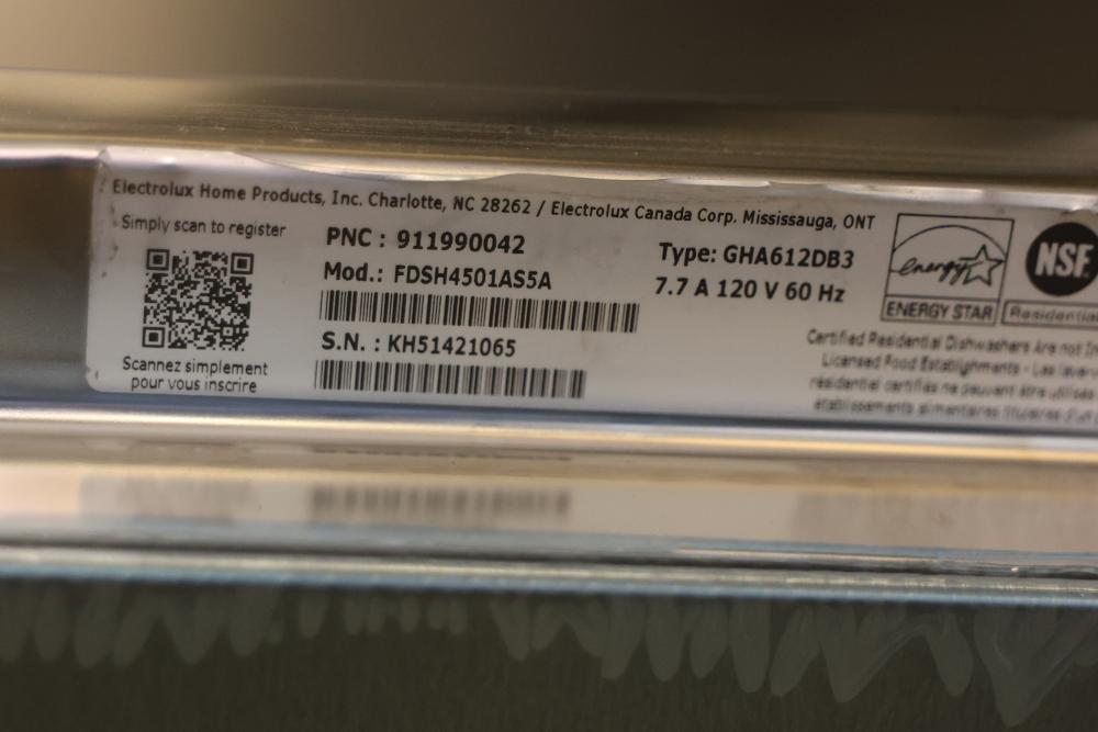 Frigidaire FDSH4501AS 24 Inch Stainless Steel Top Control Dishwasher. Features a top control design and stainless steel finish. Condition may vary, see photos for details. Includes Energy Star certification and model details as specified. Pickup only.