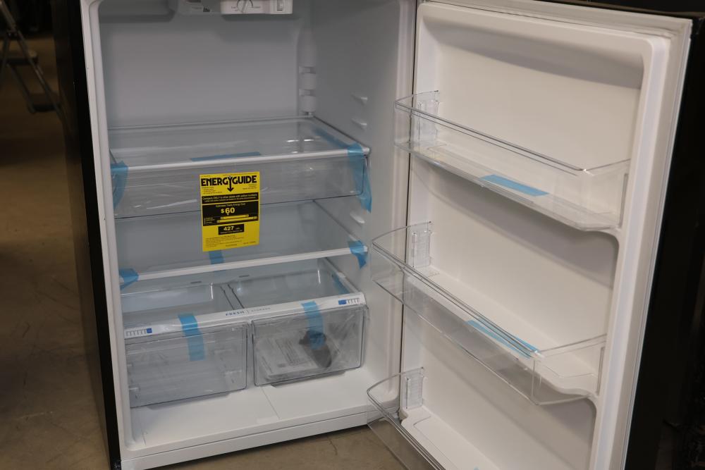 Frigidaire FFTR2045VB 30 Inch Freestanding Top Freezer Refrigerator with 20 Cubic Ft Capacity. Features a spacious interior with adjustable shelves, clear storage drawers, and convenient door bins for versatile organization. Condition may vary, see photos for details. Pickup only.