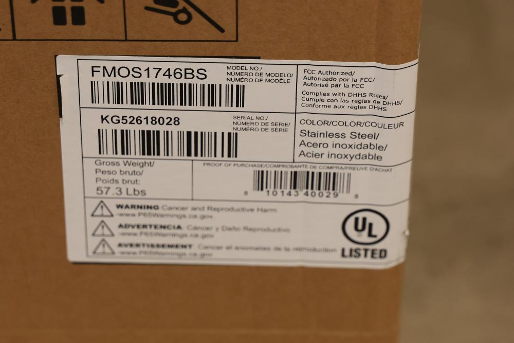 Frigidaire 30 Inch Over-The-Range Microwave FMOS1746BS With 1.7 Cubic Feet Capacity. Condition may vary, see photos for details. Appears to include original packaging and components. Stainless steel design with digital control panel. Pickup only.