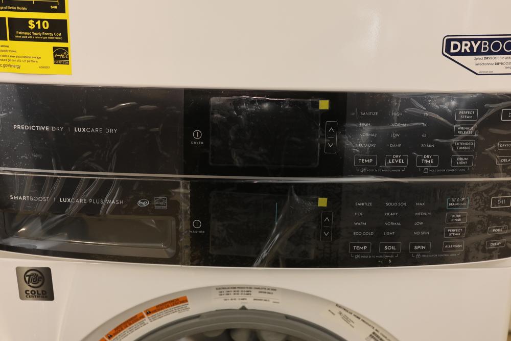 Electrolux ELTE7600AW 27 Inch Electric Wash Tower with 4.5 Cubic Feet Washer Capacity and 8 Cubic Feet Dryer Capacity. Features a predictive dial, smart boost, and other efficient mechanisms. Condition may vary, see photos for details. Pickup only.