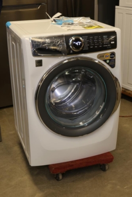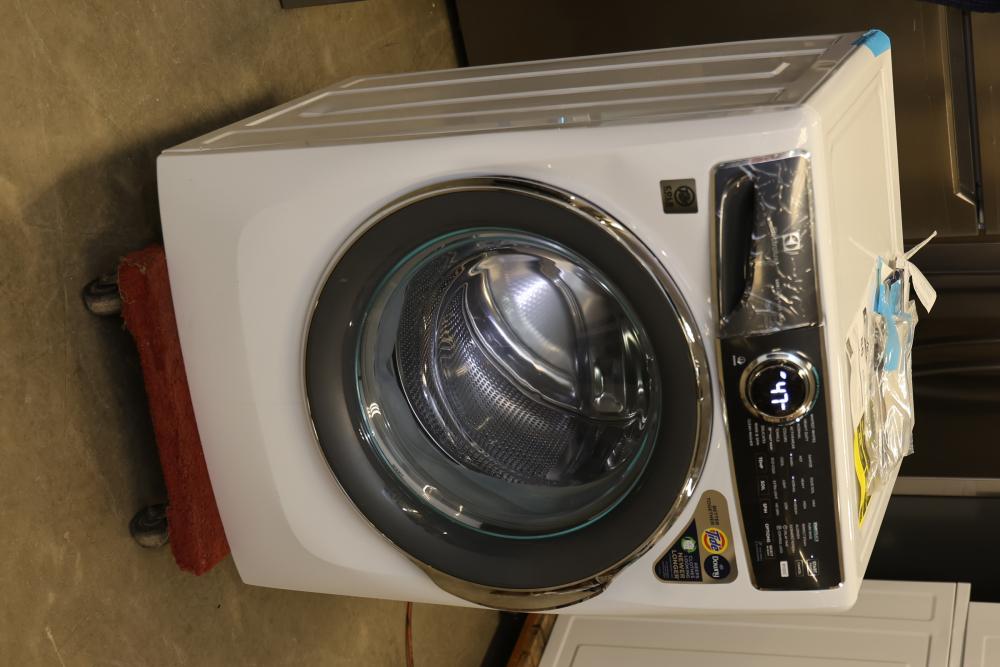 Electrolux front load washer, model ELFW7537AW2, featuring a 4.5 cubic feet capacity. Operates at 120V, 60Hz, and 12 amps. Designed for energy efficiency and equipped with advanced washing technology. The unit is functional but has a dent on the side preventing the door from closing, requiring repair. Identifiable serial number 4C51400001. Pickup only.