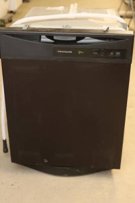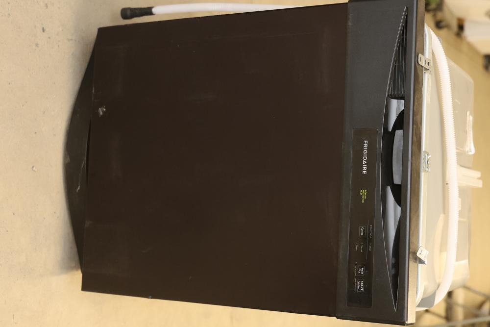 Frigidaire FDPC4221AB 24 Inch Black Front Control Smart Built-In Tall Tub Dishwasher. Unit falls forward when the door is opened fully and requires repair. Includes various visible connections and standard internal racks. See photos for further details and condition of the unit. Pickup only.