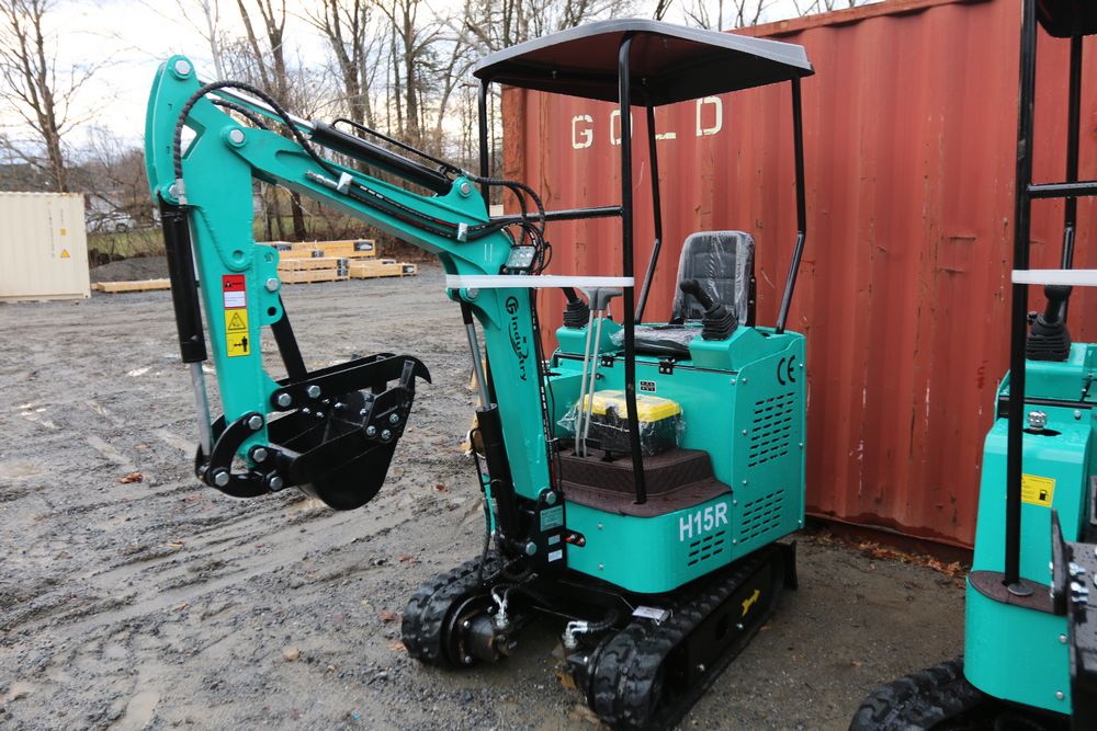 New 2025 CFG Industrial gas powered mini Excavator model H15R with 420cc gasoline engine, bucket, 4' long tracks, 38.5" wide base, 6" wide tracks, canopy, hydraulic boom & bucket controls, pilot system, thumb, dozer blade. Hours reading less than 1 hour.